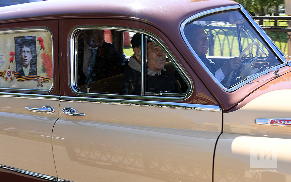 Рустам Минниханов принял участие в церемонии возложения венков в парке Победы. Он прибыл туда на ретроавтомобиле, на боковом стекле которого было закреплено фото его дяди Галимзяна Минниханова