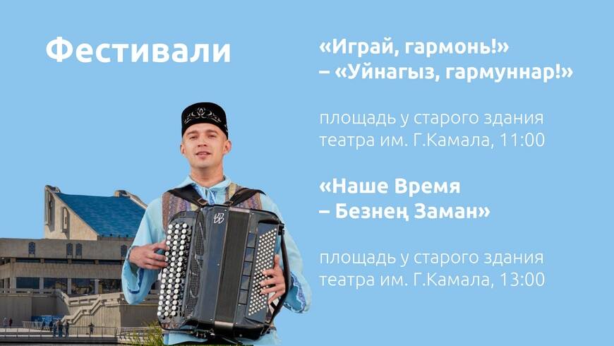 На площади у старого здания театра Камала в 11.00 пройдет народный праздник «Уйнагыз, гармуннар!». Более 1 тыс. участников, включая гармонистов из Татарстана и других регионов России, продемонстрируют виртуозное мастерство. После коллективов на сцену выйдут финалисты конкурса творческой молодежи Казани «Наше время – Безнен заман», продолжая праздничную концертную программу.