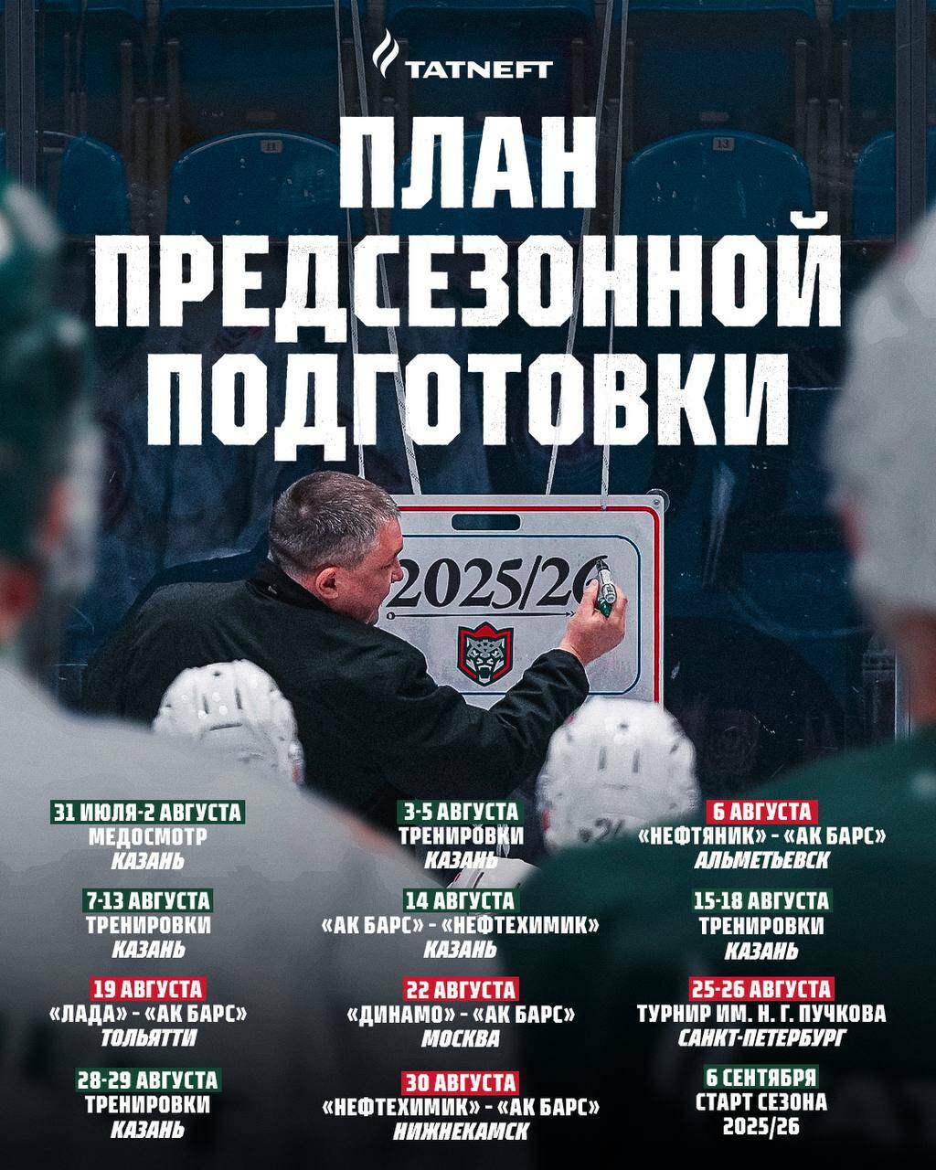 Пресс-служба «Ак Барса» в своем телеграм-канале выложила расписание предсезонки.