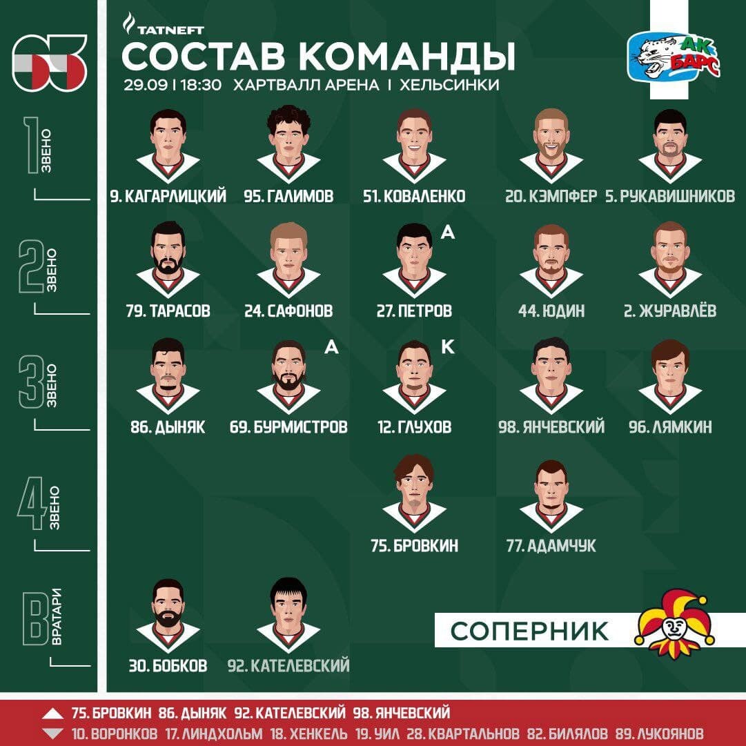 Таким образом, в сегодняшнем матче в столице Финляндии с «Йокеритом» казанский «Ак Барс» не сможет рассчитывать на голкиперов Артура Ахтямова и Шамиля Валиуллина, защитника Кристиана Хенкеля, нападающих Джордана Уила, Дмитрия Воронкова и Пера Линдхольма. Это создало немало проблем тренерскому штабу казанской команды при определении состава на матч, который начнется сегодня в 18:30 по московскому времени. Всего в заявку «Ак Барса» на игру включены лишь 19 игроков.
