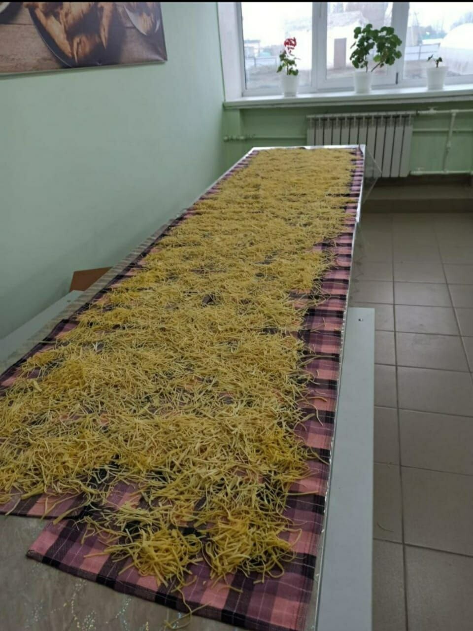 Неравнодушные к судьбе Родины волонтеры и председатели родительских комитетов учебного заведения активно приступили к работе. За один выходной день они изготовили лапшу из 30 листов теста.