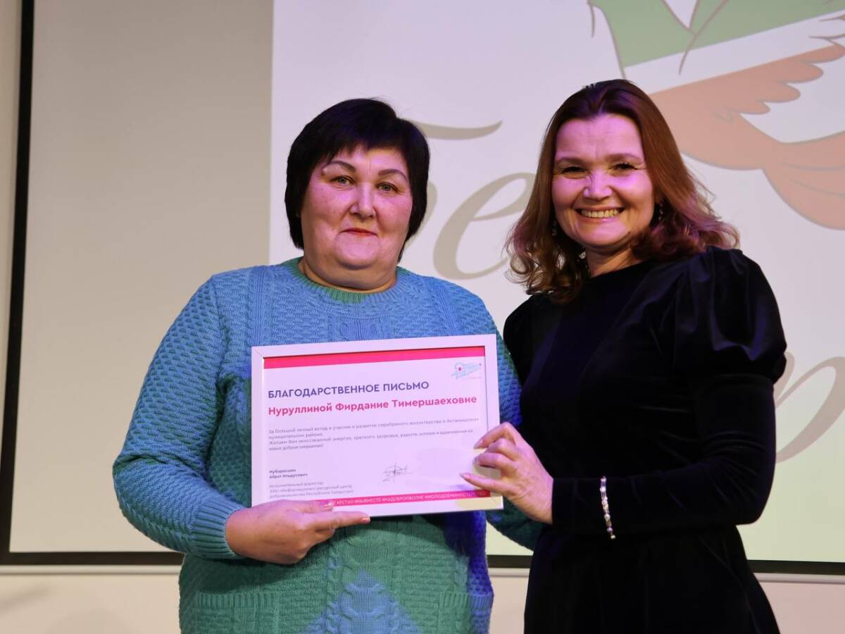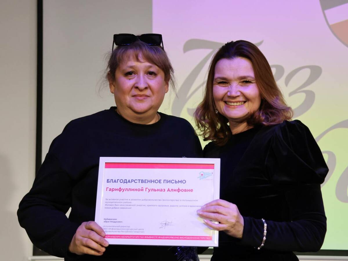 Актанышские волонтеры «Мы вместе» награждены благодарственным письмом Информационно-ресурсного центра добровольчества Республики Татарстан. Вручение состоялось на сцене — на первом в 2025 году концерте благотворительной группы «Мы вместе».