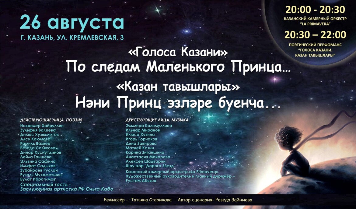 Затем зрителей ожидает музыкально-поэтическое путешествие «По следам Маленького принца». Трогательную историю о мечте, любви и дружбе им поведают ведущие актеры театров им Г.Камала, К.Тинчурина, ТЮЗа и воспитанница детской татарской театральной студии «Апуш».