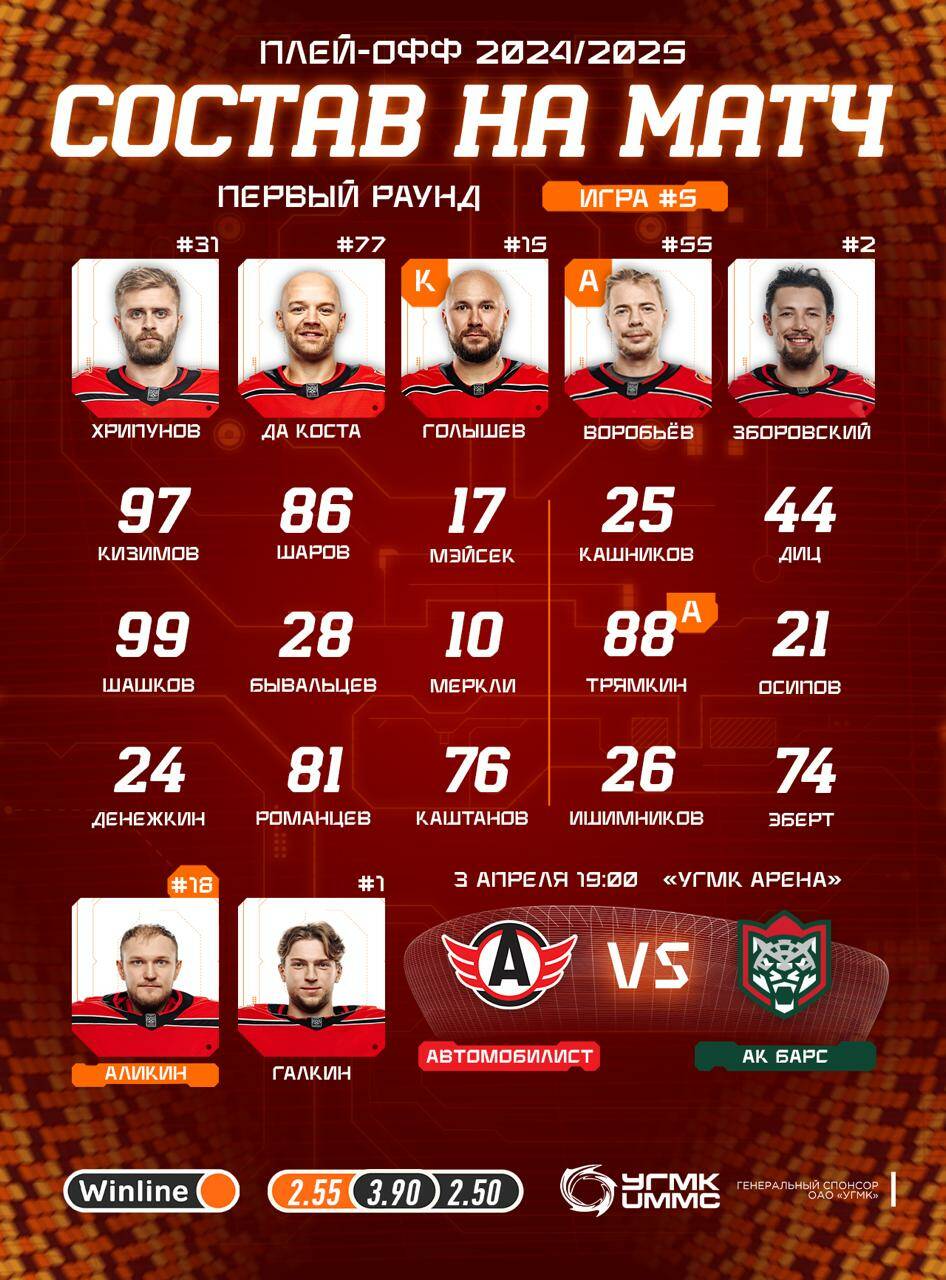 «Ак Барс» и «Автомобилист» представили составы на четвертую игру 1/8 финала Кубка Гагарина.