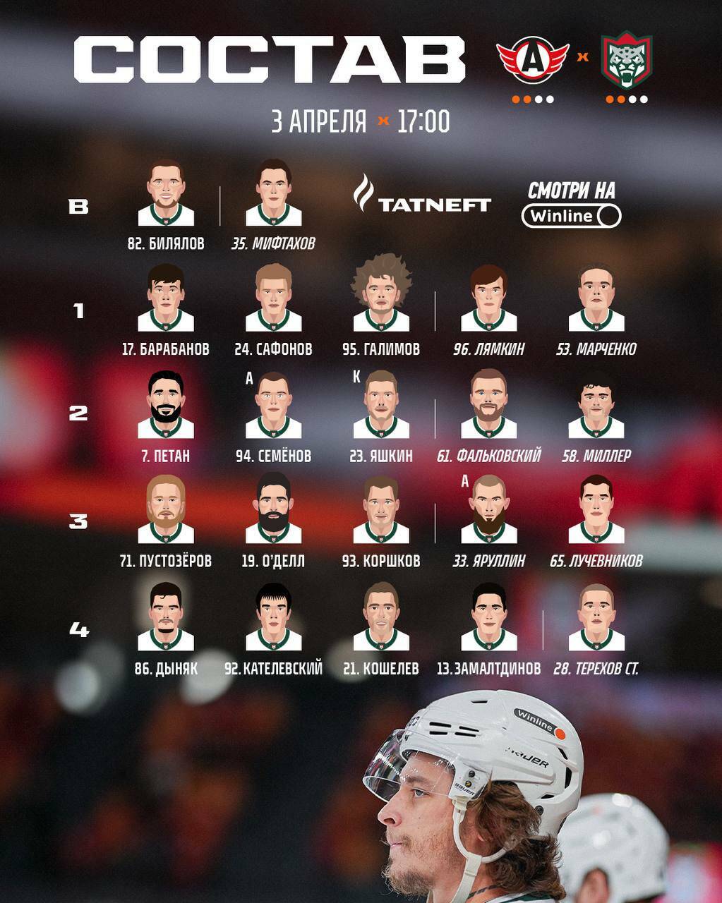 Анвар Гатиятулин решил не менять победный состав. Константин Лучевников по-прежнему играет в третьей паре обороны вместо Артемия Князева. В воротах Тимур Билялов. Полный состав можно посмотреть здесь: