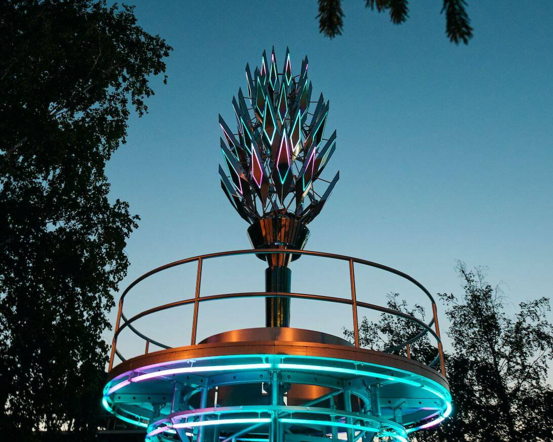 Серию работ из Альметьевска, созданных в рамках программы «Сказки о золотых яблоках», представило бюро «Новь». В числе экспонатов – фотографии муралов и арт-объектов: диптих «История яблок» римского художника Hitnes, работа «Защитник» грека Fikos, а также «лепесток» инсталляции «Солнечный факел» Виктора Полякова, реагирующий на солнечные вспышки.