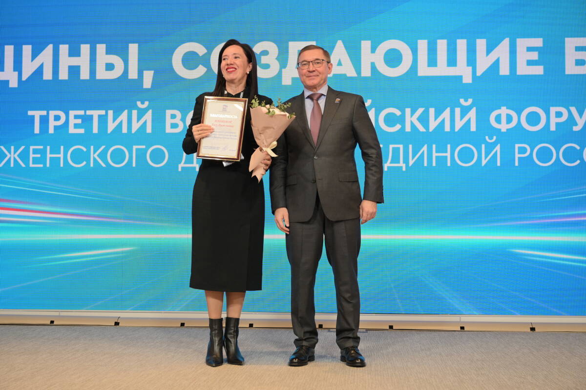 По итогам форума Секретарь Генсовета партии Владимир Якушев вручил Алсу Набиевой благодарственное письмо за успешную реализацию проекта и вклад в развитие женского лидерства в Татарстане.