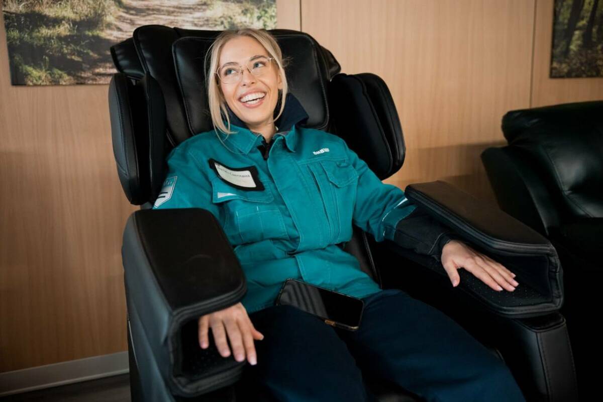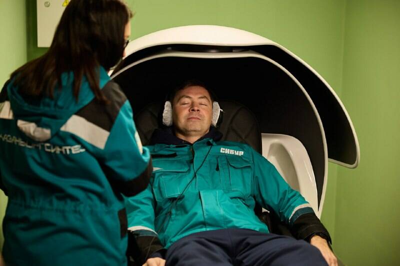 Большое впечатление на звездных гостей во время экскурсии по предприятию оказала комната психологической разгрузки, где все сотрудники предприятия могут отдохнуть в массажных креслах, угоститься кислородным коктейлем или пообщаться с психологом. В просторном кабинете расположились массажеры, есть даже специальная капсула для сна. Ее сразу опробовал на себе Динияр Билялетдинов.