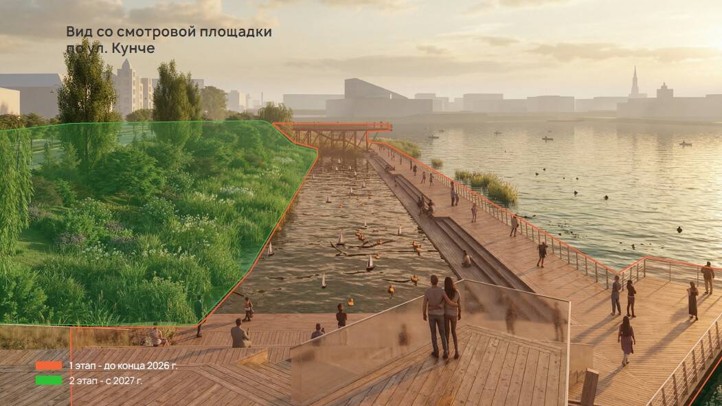 Одной из ключевых точек станет территория напротив завода братьев Крестовниковых. Здесь обустроят широкий деревянный настил площадью около 2,5 тыс. кв. метров.
