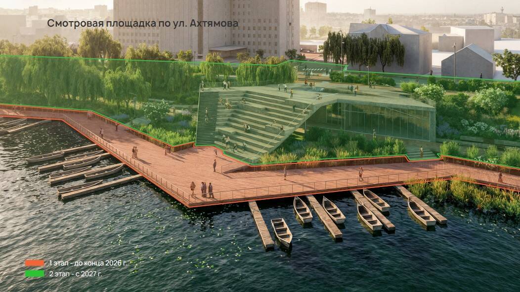 Еще одна важная точка проекта третьей очереди набережной – участок, прилегающий к улице Ахтямова. Берег на этом участке – самый широкий в пределах третьей очереди, что позволит разместить павильон с кафе и общественным туалетом. Также там расположится офис лодочной станции, где можно будет арендовать катамараны для прогулок по озеру.