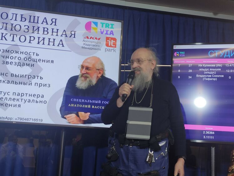 (Казань, 20 марта, «Татар-информ», Арсений Каримов). В Казанском IT-парке прошла экспериментальная инклюзивная викторина от Нурали Латыпова. Специальным гостем стал Анатолий Вассерман. В игре определили двух победителей: среди тех, кто играл онлайн и тех, кто находился в студии. Они получили по сертификату на покупку планшета и фигурку совы.
