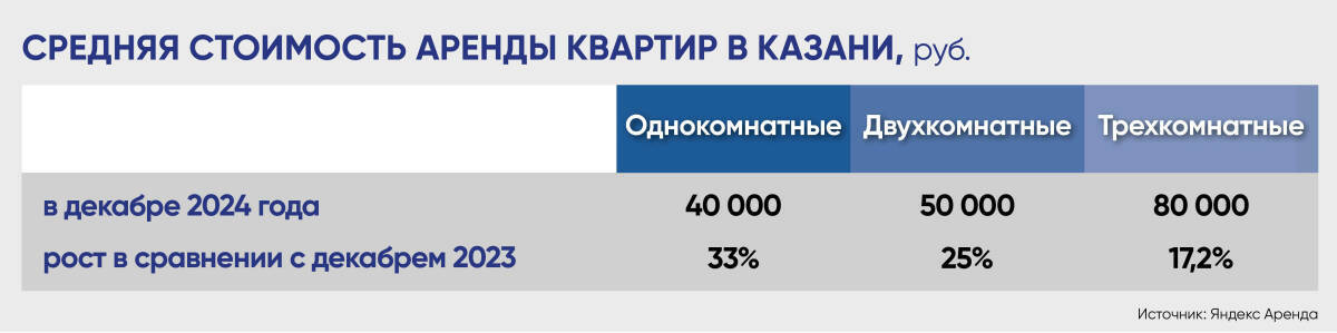 Медианная стоимость долгосрочной аренды квартир в столице Татарстана составила почти 50 тыс. рублей. За год ставка увеличилась на 24,3%, рассказал «Татар-информу» руководитель сервиса «Яндекс Аренда» Роман Жуков. При этом однокомнатные в Казани выросли в цене на 33,3% – до 40 тыс., двухкомнатные – на 25%, до 50 тыс., трехкомнатные – на 17,2%, до 80 тыс. рублей.