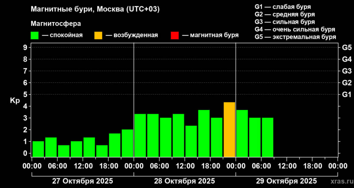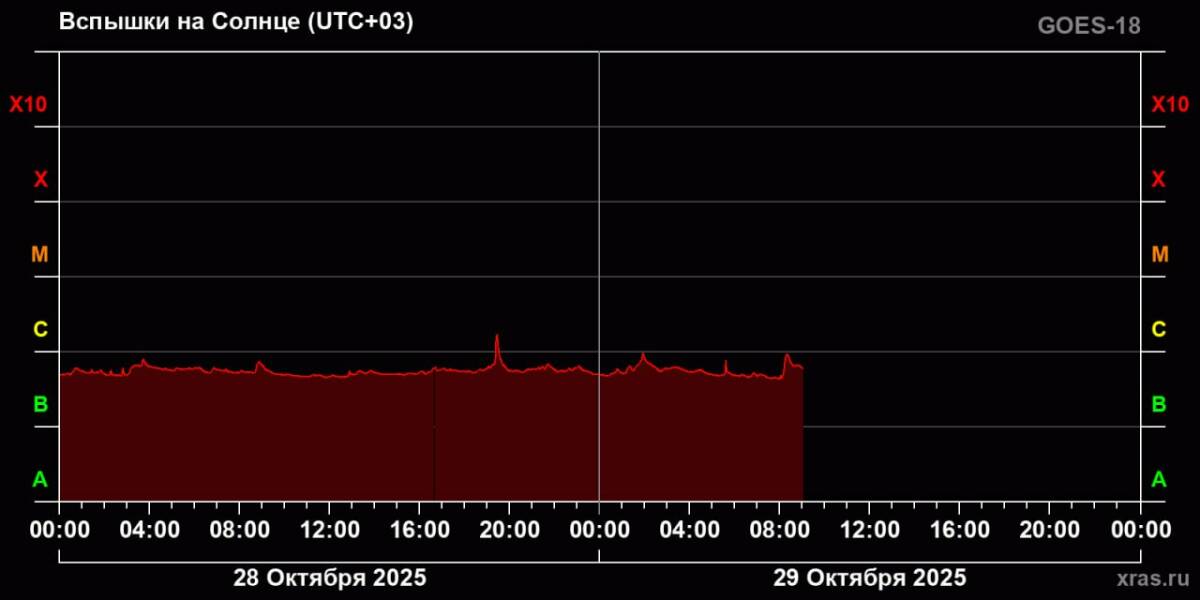 При этом в минувшие сутки геомагнитная обстановка была слабо возмущенной, а вспышечная активность – спокойной. Ожидается, что сегодня последняя будет не более интенсивной, чем накануне.