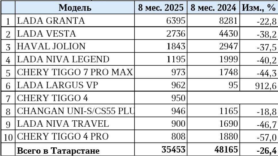 С начала 2025 года самой продаваемой новой машиной в Татарстане стала LADA Granta. За период с января по август в республике было продано 6 395 автомобилей данной модели. Об этом «Татар-информу» сообщил руководитель пресс-службы агентства «Автостат» Азат Тимерханов.