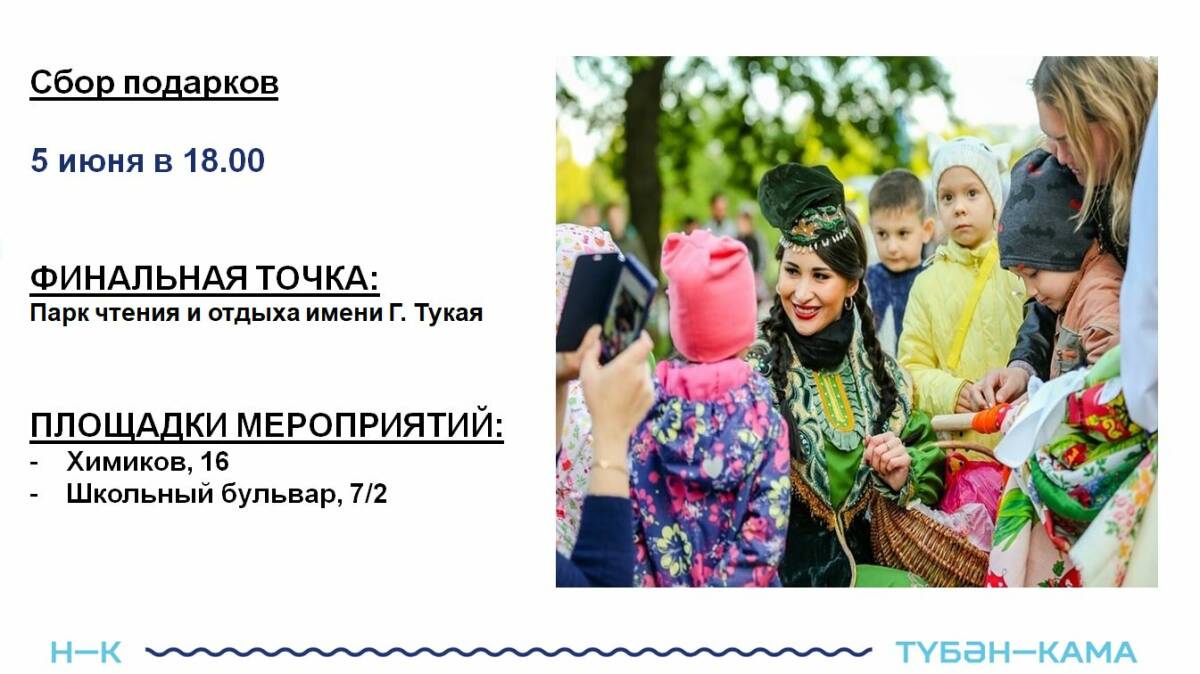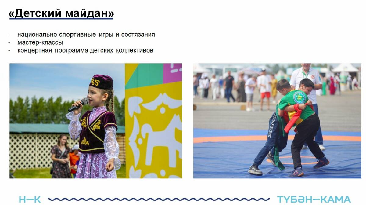 Маленьких гостей ждут спортивные и народные игры, мастер-классы и выступления детских коллективов. Будут организованы традиционные соревнования по көрәш среди детей, бой мешками, вертикальный и наклонный шест. На литературной площадке библиотеки – выставка национальной одежды и книги о Великой Отечественной войне.