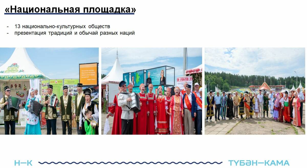 Праздник объединит 13 национальных обществ. В палатках культурных объединений татар, русских, кряшен, чувашей, башкир, марийцев, удмуртов, армян, таджиков, узбеков, дагестанцев и других народов будут представлены костюмы, блюда, музыка, танцы, народные инструменты и декоративно-прикладное искусство. Каждое объединение презентует свою культуру с любовью и теплотой.