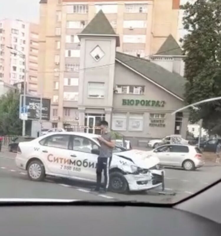 От удара оба автомобиля развернуло поперек дороги, а у машины такси вырвало переднее колесо.Теперь водителю придется вызывать эвакуатор, чтобы убрать своего железного коня с проезжей части.