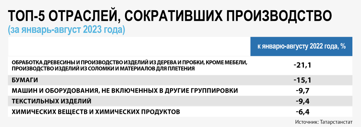 В списке аутсайдеров тоже все по старинке. За восемь месяцев года производство в Татарстане сократилось в десяти отраслях, сильнее всего, что уже давно не удивляет, в обработке древесины (минус 20,1%), бумаги и бумажных изделий (на 15,1%). Но в то же время снижение продолжается в производстве машин и оборудования, не включенных в другие группировки (на 9,7%), а также в текстильной промышленности (на 9,4%).