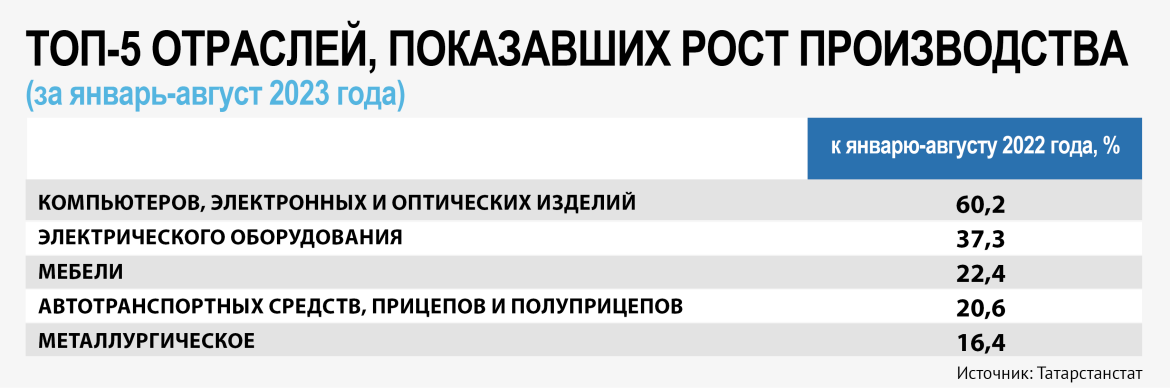 Двукратные темпы роста в республике сохраняют производители компьютеров, электронных и оптических изделий (на 60,2% за восемь месяцев года), электрооборудования (на 37,3%), мебели (на 22,4%), металлургии (на 16,4%), а также прочей неметаллической минеральной продукции (на 12,1%). Немного снизили темпы, но остались в зоне роста одежда и готовые металлические изделия.