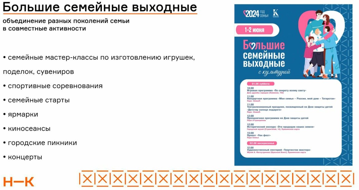 Помимо этого, будет проведен ряд мероприятий, направленных на укрепление института семьи, возрождение и сохранение традиций семейных отношений. Одним из таких примеров является проект «Семейные выходные».