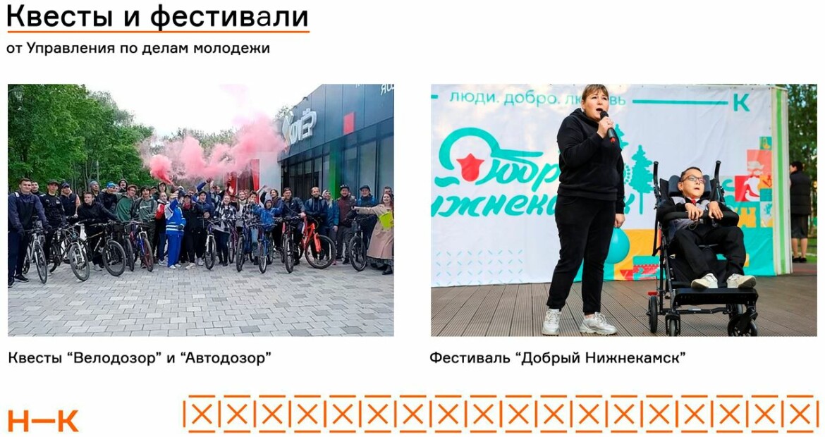 Также в Нижнекамском районе уделяется внимание поддержке и развитию молодых людей. Управление по делам молодежи для летнего периода подготовили увлекательные квесты «Автодозор», «Велодозор», на территории автовокзала — соревнования по автозвуку, а также семейные мероприятия, направленные на укрепление семьи и популяризацию здорового образа жизни.