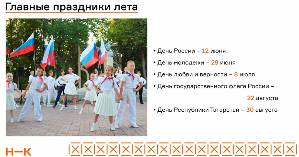 Также в парках и скверах пройдут мероприятия, посвященные праздникам: День России — 12 июня; День молодежи — 26 июня; День любви и верности — 8 июля; День государственного флага РФ — 22 августа и День Республики Татарстан — 30 августа.
