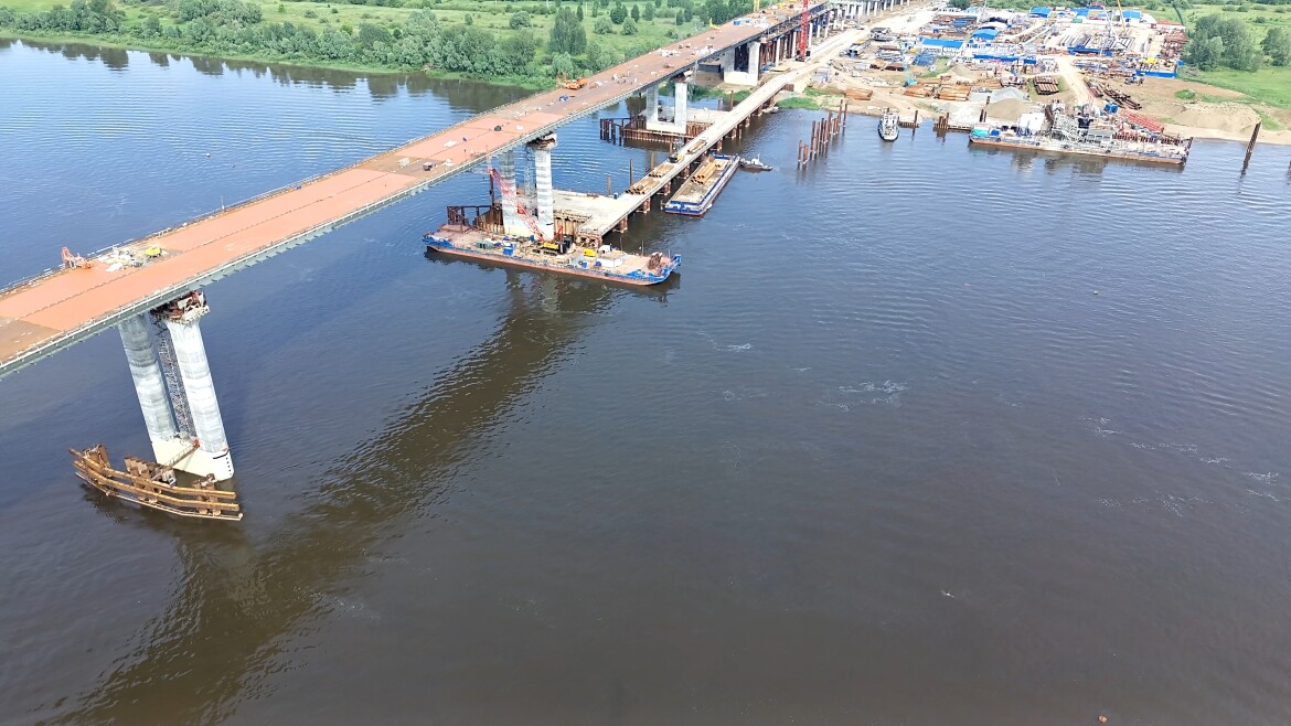Сейчас ведется монтаж балок и устройство пролетного строения эстакадной части моста, а также строительство подходов к искусственному сооружению. Всего мостовики смонтируют 15 пролетов, на каждом из которых установят по 11 сборных железобетонных балок длиной 33 метра. Кроме того, идет армирование и бетонирование монолитных участков пролетного строения.