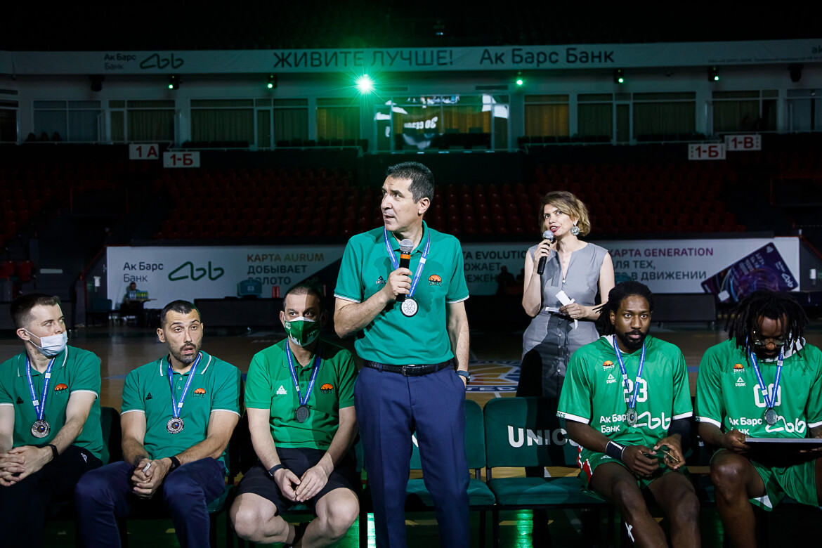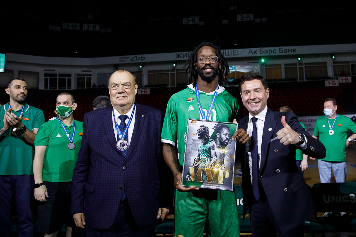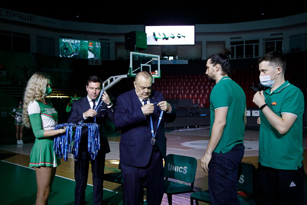 Затем Богачев и Леонов вручили команде третий комплект медалей этого сезона – чемпионата России по баскетболу. Таким образом, сезон получился трижды серебряным – в Кубке Европы, Единой лиге ВТБ и чемпионате России. Джон Браун был признан MVP сезона по версии болельщиков клуба и получил за это специальный приз. Президент УНИКС вручил серебро и Леонову.
