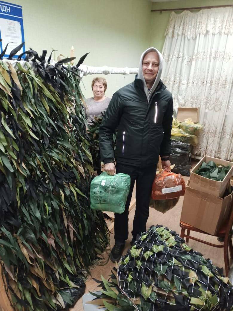 Беляев рассказал, что в районе продолжается работа по плетению маскировочных сетей. Из села Татарские Челны волонтеры отправили масксети защитникам-землякам.