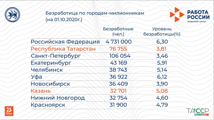 «Сегодня ситуация на рынке труда понемногу стабилизировалась, хотя напряжение сохраняется. Сейчас в качестве безработных в Казани зарегистрированы свыше 32 тыс. человек, что почти в 10 раз больше, чем год назад. Много лет уровень безработицы в Казани был минимальным, даже во время экономических кризисов. Пандемия, к сожалению, расшатала эту стабильную ситуацию, когда на каждого безработного приходилось по пять, а то и семь вакансий, многие предприятия активно искали сотрудников. Сейчас в службе занятости 16 тыс. вакансий, то есть одна вакансия приходится на двух безработных», — прокомментировал он цифры, озвученные замдиректора центра занятости населения города Гульнарой Филипповой.