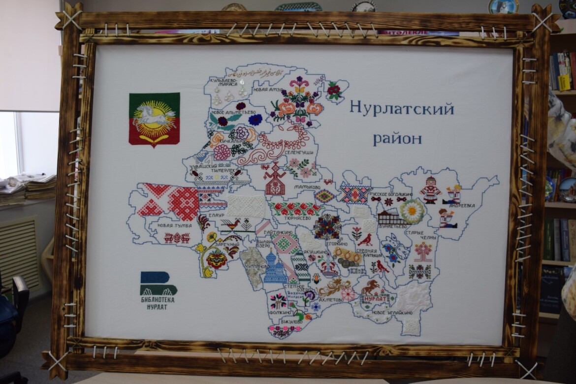 На карте при помощи мулине крестом, гладью, тамбурным швом, швом назад иголкой, в стиле браного ткачества отображены все 26 сельских поселений и город Нурлат.