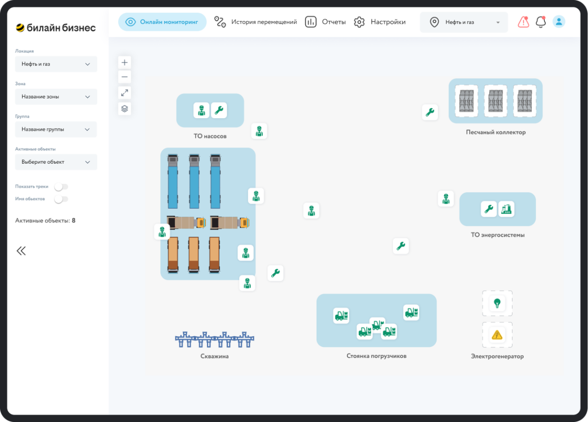 Платформа трекинга предоставляет широкий набор функций, доступных через веб-сервис. Это решение позволяет бизнесу вести мониторинг перемещения сотрудников, объектов и транспортных средств, контролировать их местоположение и получать данные о передвижениях по заданным зонам на предприятии. Платформа предлагает ряд специализированных отчетов для более детального анализа полученных данных.