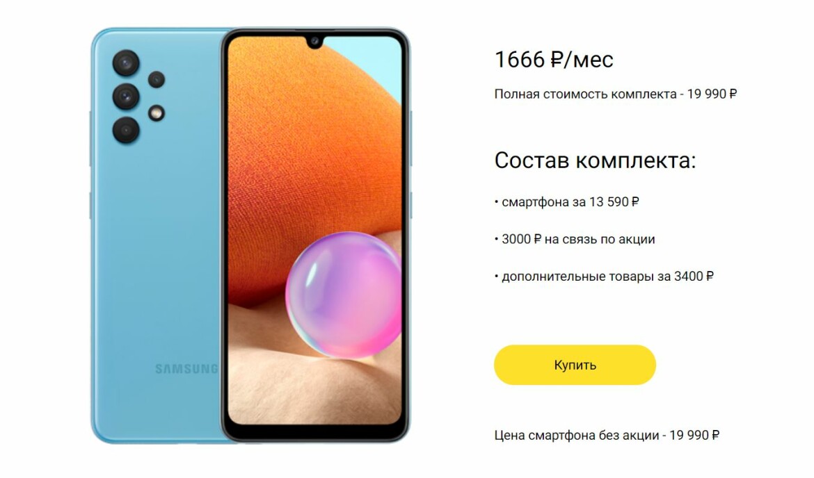 Можно как приобрести готовый комплект, так и составить его самостоятельно. Например, в акционный комплект вместе с популярным смартфоном Samsung Galaxy А32 64 ГБ входит тариф «Близкие люди 2», опция «3 000 рублей на связь по акции» на полгода, аксессуары на сумму 3 400 рублей или другие девайсы и услуги на выбор. Среди них: детские часы, услуга «Защита экрана», подписки «4 в 1», more.tv или START в составе сервиса «Билайн ТВ» (12+) на полгода. Общая стоимость комплекта составит 19 990 рублей или же всего 1666 рублей в месяц при условии покупки в кредит на 12 месяцев.