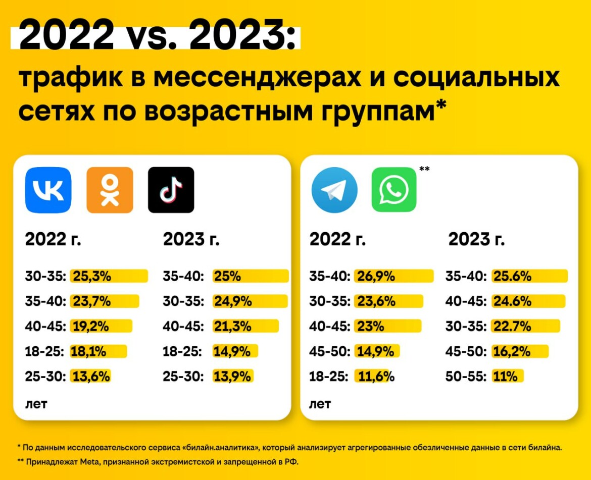 В 2023 году самый многочисленный возрастной сегмент для соцсетей изменился с 30–35 на 35–40 лет по сравнению с 2022 годом. В мессенджерах больше всего трафика расходуют пользователи в возрасте 35–40 лет, однако если раньше на втором месте была категория 30–35 лет, то сейчас эту строчку занимают люди в возрасте от 40 до 45 лет.