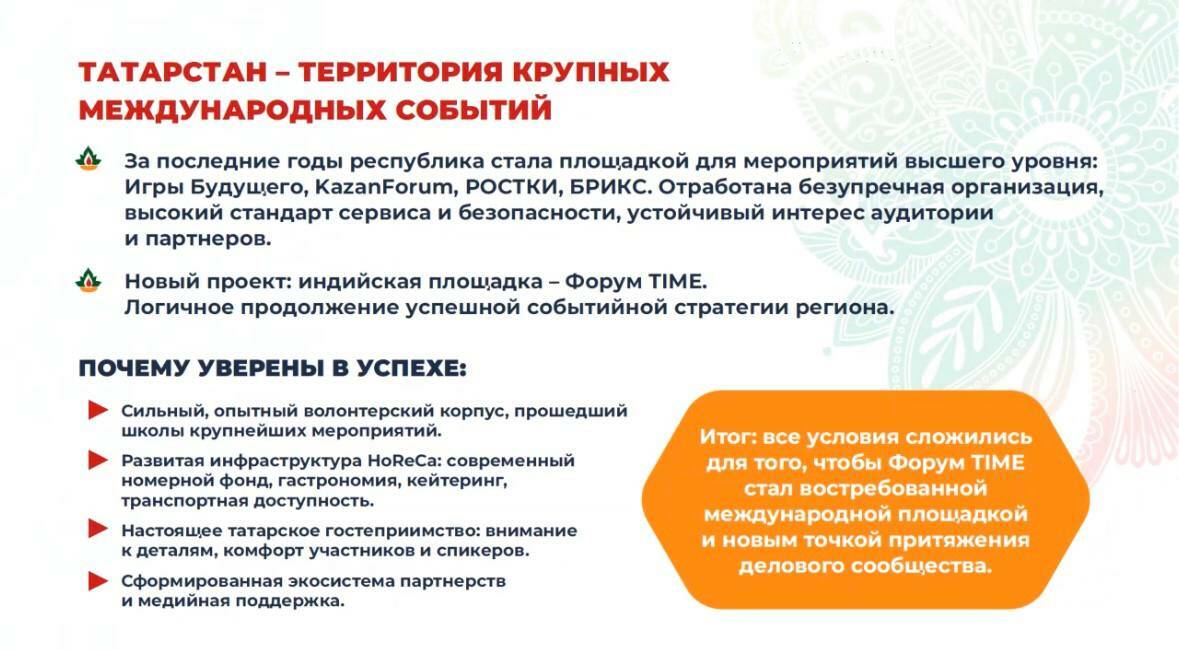 Для решения этих задач в Казани проведут первый бизнес-форум с запоминающимся названием TIME. Он должен вывести экономические отношения России и Индии на новый уровень. Форум организуется при поддержке Министерства иностранных дел РФ и посольства Индии в России.