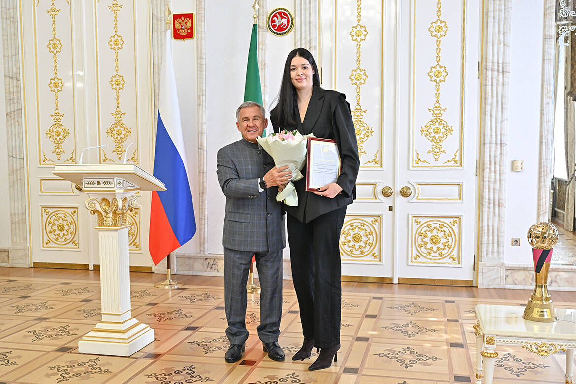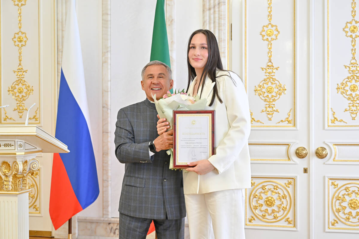Сегодня в Казанском Кремле Раис РТ Рустам Минниханов поздравил женскую волейбольную команду «Динамо-Ак Барс» с завоеванием восьмого титула и победой в чемпионате России в сезоне-2025/26. Торжественная церемония началась с чествования казанских спортсменок и вручения государственных наград и подарков. Кроме того, глава республики вручил благодарность клубу и сертификат в размере 5 млн рублей.
