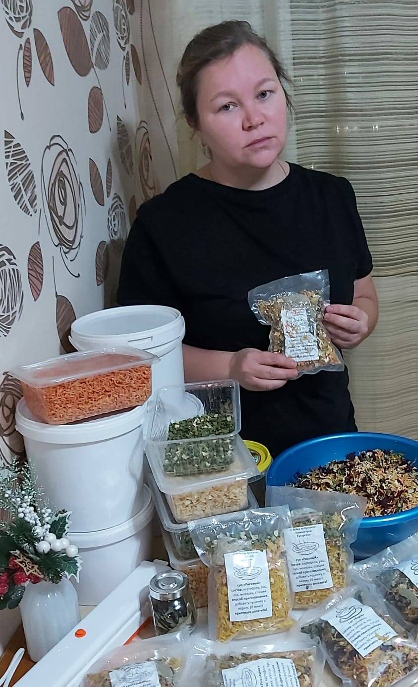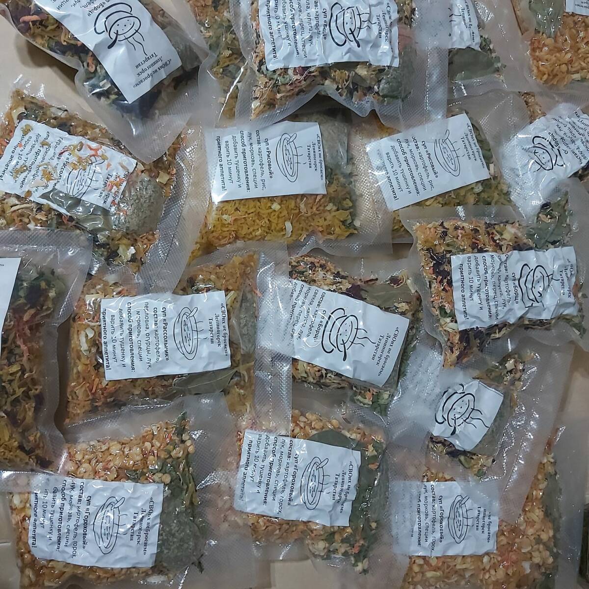 Она рассказала о том, как ей пришла идея готовить супы для фронта: «Когда по осени появились излишки урожая овощей со своего огорода, я стала готовить заготовки супов для бойцов СВО. Ведь у них не всегда есть возможность получить полноценный горячий обед в полевых условиях. Нет, его не готовят в кастрюлях, не разливают по банкам. Его фасуют по пакетам, потому что этот суп — сухой. Электрическая сушилка у меня уже была, поэтому я стала сушить овощи и фасовать, чтобы у ребят на передовой был домашний сытый и полезный суп, как дома», — считает активистка.