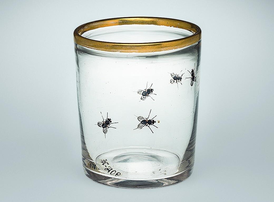 Например, будет картина, которая имитирует мраморный рельеф, или будто бы гравюра, но это вышивка волосом портрета Цицерона. А еще, например, капуста из фаянса, имитация морского дна, имитация малахита — это роспись по фарфору, уникальное нагрудное украшение из семян огурца и бисера… Или прозрачные стаканы с мухами на их стенках — такие предметы были популярны у аристократии XIX века. Мухи становились объемнее, когда в стакан наливали воды.
