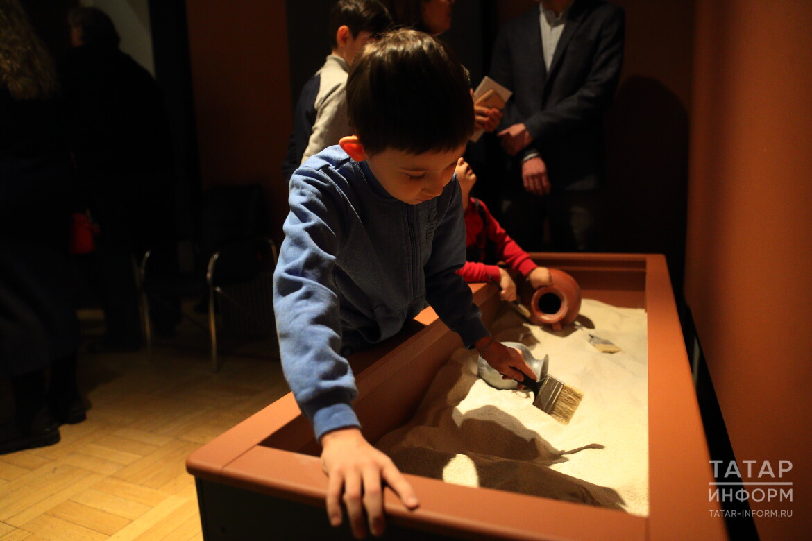 C нашими «археологическими» раскопками разный был опыт. Песок мы периодически увлажняли, чтобы он не разлетался, как пыль. Не только дети, но и взрослые здесь раскапывали находки активно. Все приходит с опытом: сначала здесь можно было отыскать и копию скульптуры головы Македонского, потом мы стали использовать ее для интерактивных программ, а сюда мы распечатали на дно коллаж с предметами выставки. Но и керамические предметы здесь по-прежнему можно найти.