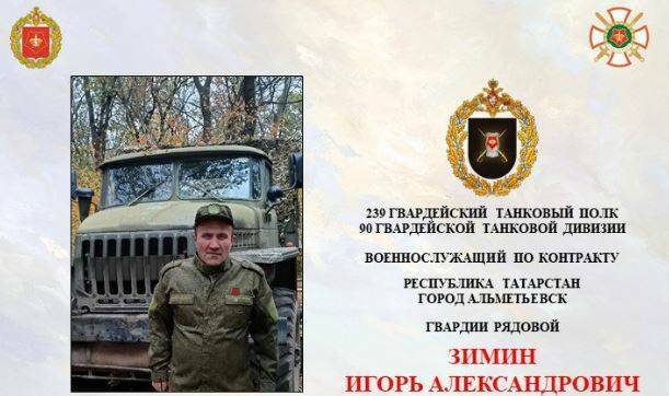 12 августа 2024 года в районе населенного пункта Желанное рядовой Зимин выполнил задание по снабжению подразделений 239 танкового полка горючим и смазочными материалами. На обратном пути колонна попала под артиллерийский обстрел, результате чего техника вышла из строя.