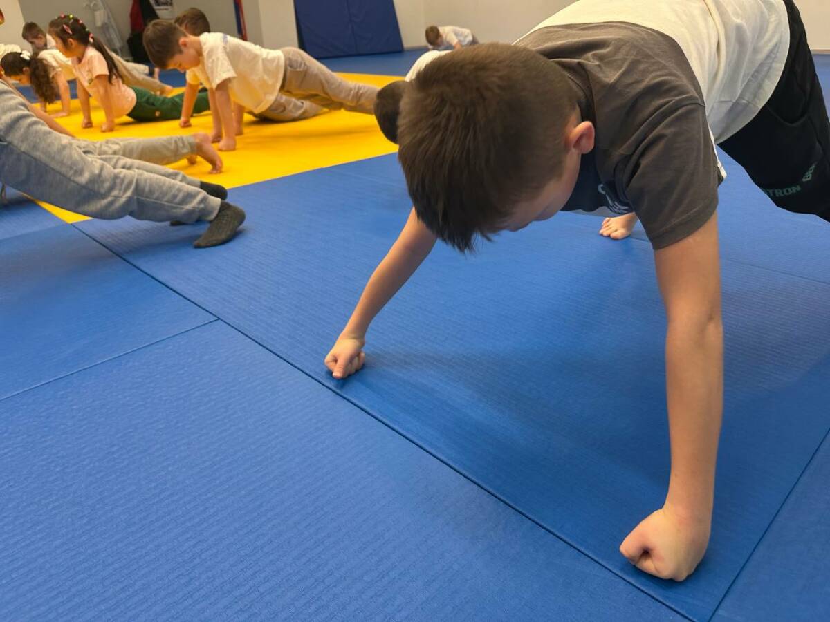 Также братья Шишкины показали ребятам утреннюю зарядку спецназовца и повторили с первоклашками основы дзюдо, которые они изучают в настоящее время на уроках проекта Федерации дзюдо России «Мой первый пояс дзюдо».