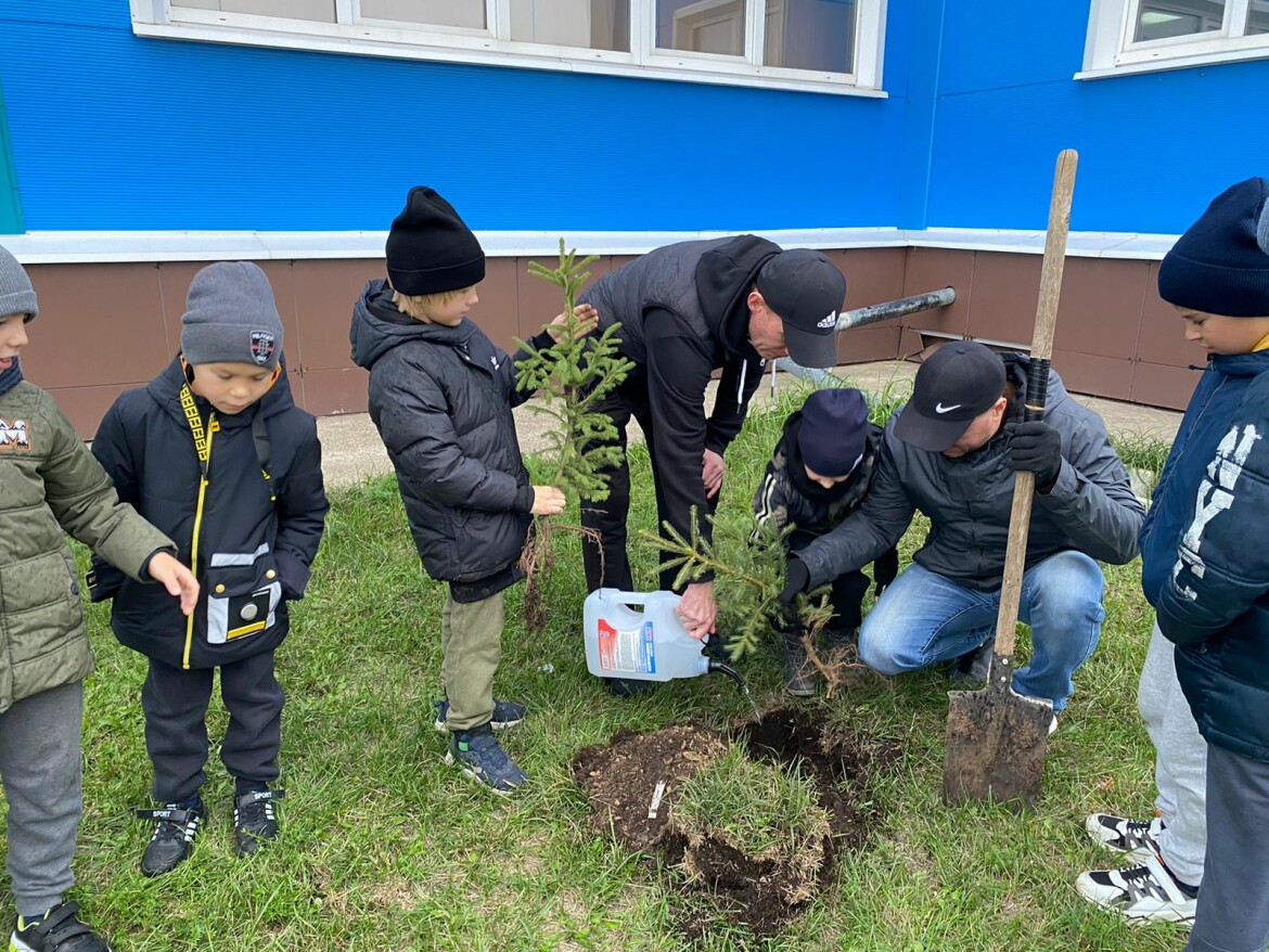 Акцию провели родители и участники хоккейной команды «Пестрецы». Рядом с ледовым дворцом они высадили ели.