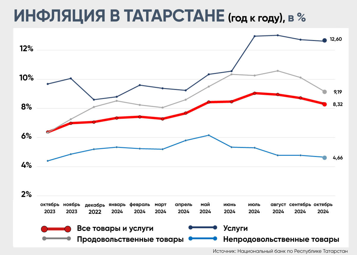 Годовая инфляция в Татарстане после пикового взлета в июле (9,04%) продолжает медленно двигаться вниз – в октябре показатель опустился до 8,32% (в сентябре было 8,71%). Это снова выше, чем в среднем по Приволжскому федеральному округу (8,15%), и ниже, чем по России в целом (8,54%).
