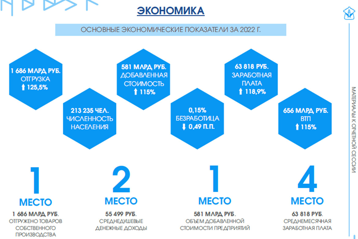 Сумма внутреннего территориального продукта за 2022 год увеличилась на 15% и составила 656 млрд рублей. Средняя заработная плата выросла на 18,9% по сравнению с 2021 годом и достигла 63,8 тыс. рублей. А уровень безработицы за 2022 год снизился с 0,64% до 0,15%.