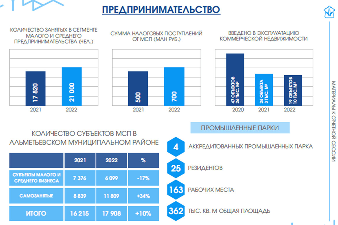 Несмотря на высокие экономические показатели, Раис Татарстана указал на те области, где Альметьевску необходимо подтянуться. Рустам Минниханов отметил, что в районе нужно больше внимания уделять развитию малого и среднего бизнеса. Так, за 2022 год количество субъектов МСП снизилось на 17% — с 7,4 до 6,1 тыс.