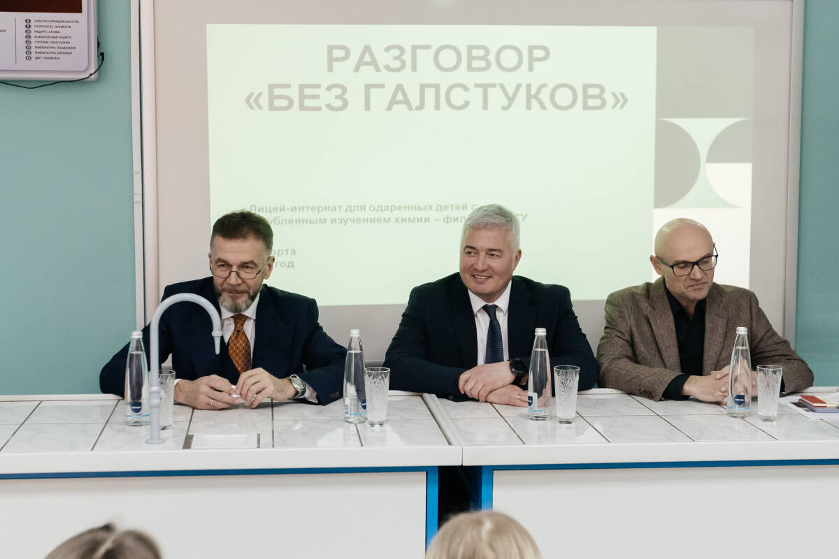 Недавно у школьников состоялся открытый диалог с представителями вузов и промышленности. К ребятам в гости заехали ректор КНИТУ Юрий Казаков, исполнительный директор и член правления СИБУРа Павел Ляхович, генеральный директор «Казаньоргсинтеза» Айрат Сафин.