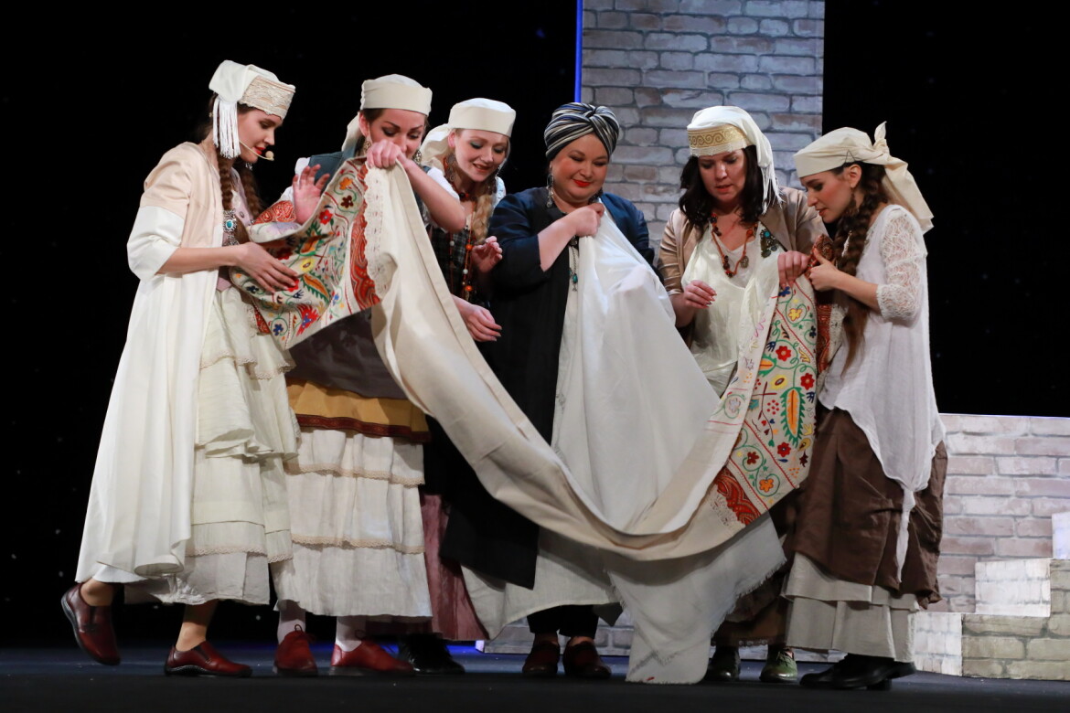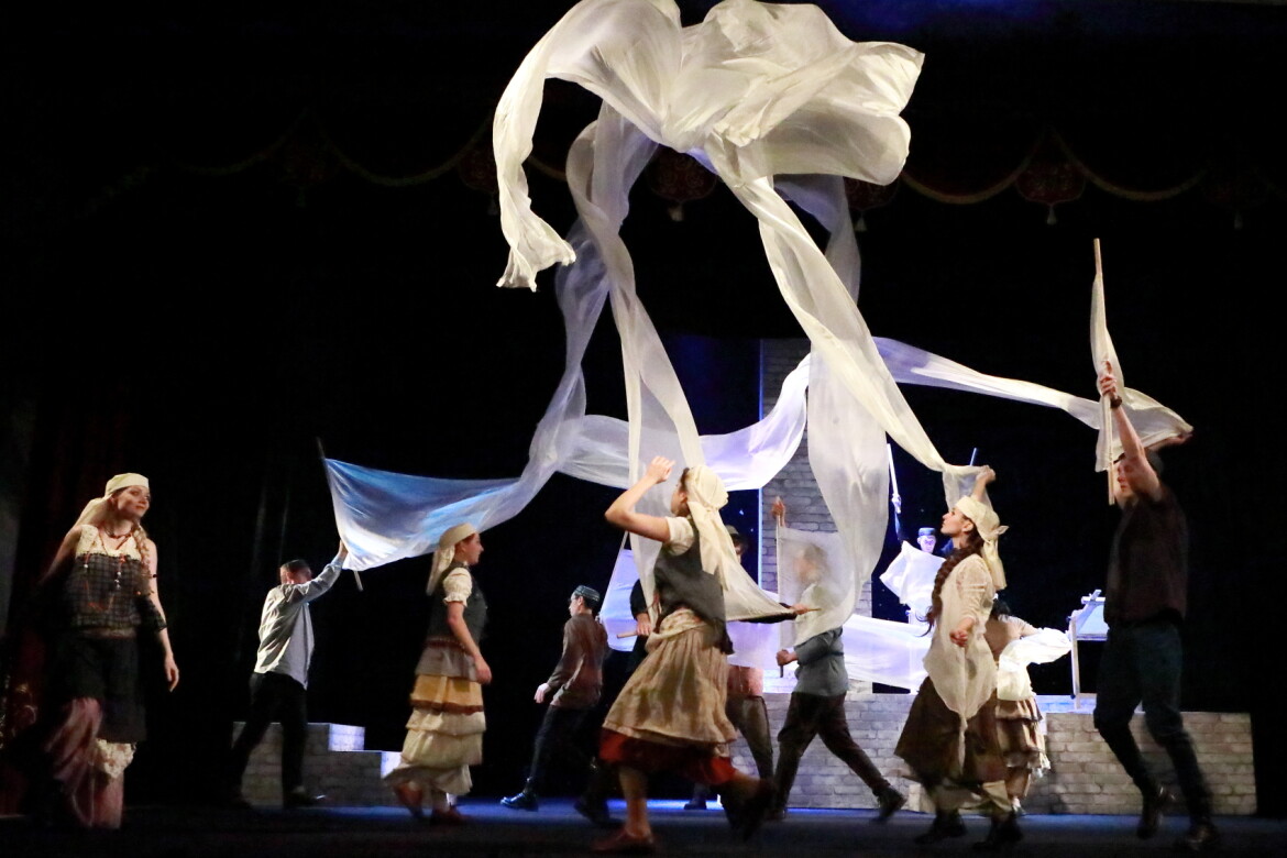 Вечерний спектакль «Казанское полотенце» по пьесе классика татарской драматургии Карима Тинчурина — это легенда о любви, о татарских Ромео и Джульетте. В постановке задействована вся молодежная часть труппы. Зрителя ждет много песен, пластики, улыбок. Один из ярких моментов — отбивание холста, танец, когда к небесам взметается эксесльсиор (невесомая ткань), а ритм вслед за музыкой отбивает сердечный ритм.