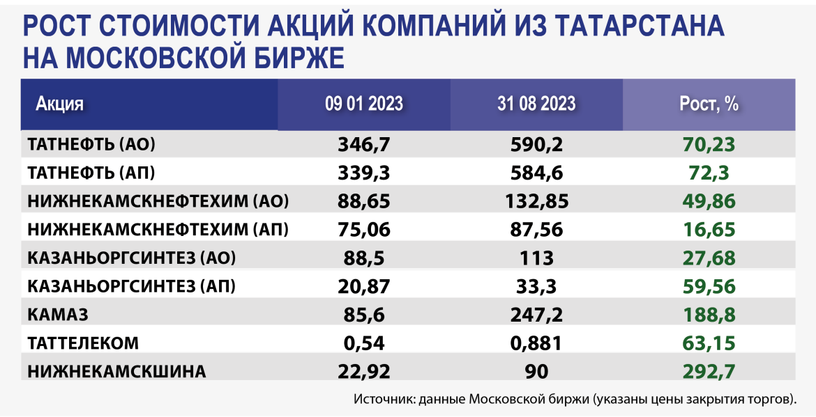 Татарстан – уникальный субъект РФ: на Московской бирже торгуются акции сразу шести республиканских компаний. Кроме абсолютной «голубой фишки» – «Татнефти», доступны для покупки ценные бумаги двух гигантов нефтехимии, входящих в СИБУР – «Казаньоргсинтеза» и «Нижнекамскнефтехима». А также КАМАЗа, «Таттелекома» и «Нижнекамскшины», в мае прошлого года неожиданно проданной «Татнефтью» республиканскому «Татнефтехиминвест-холдингу». В отраслевом разрезе – палитра, без ложной скромности, впечатляющая.