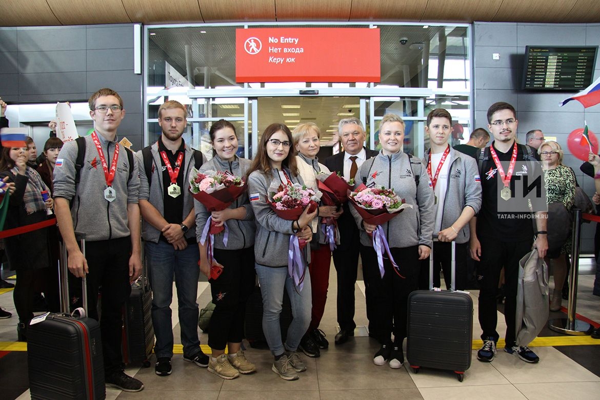 Сегодня в Международный аэропорт «Казань» прибыли татарстанские участники и победители Euroskills Budapest 2018. Чемпионов встречали родители, сокурсники и представители прессы. В зале ожидания встречающие устроили настоящее шоу с ростовыми куклами, танцами и плакатами. Студенты Казанского инновационного университета спели песню в честь героев республики.