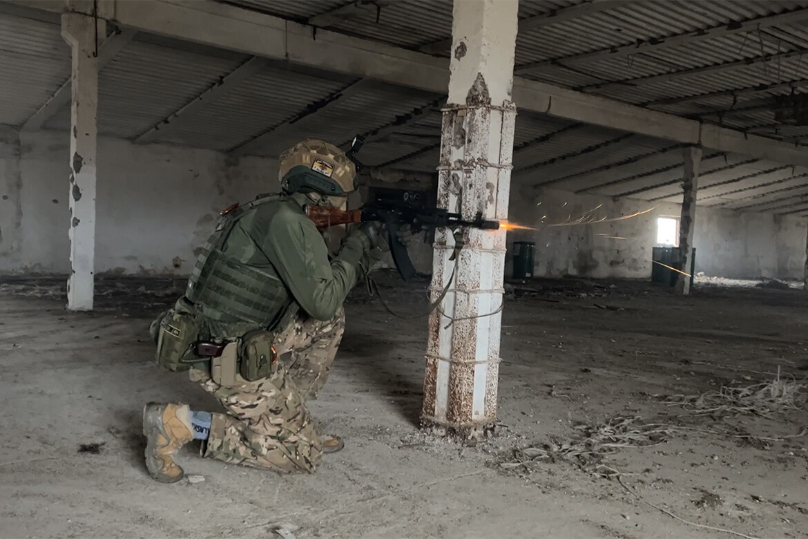 Под конец экскурсии военнослужащий с позывным Бурый проводит нас в просторное помещение с бетонными стенами, несущими колоннами и частично обрушившимися навесными потолками. Здесь солдаты тренируются, улучшают навыки владения полевой медициной, пристреливают и чистят оружие.